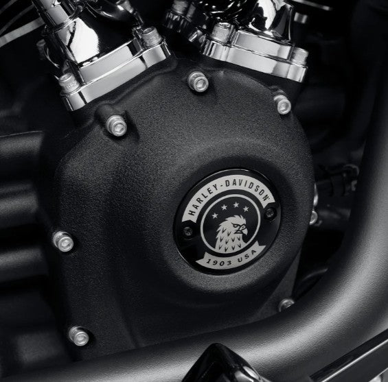 Two iconic symbols of freedom and strength are celebrated in this stunning decorative component. A stylized eagle and the Bar & Shield logo are laser etched in black-anodized billet aluminum to achieve brilliant highlights with sharp detail.