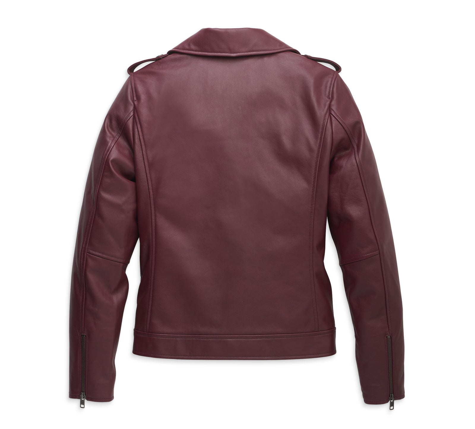 Chic leather styling goes all in on our Full Speed Leather Jacket. It’s crafted from a buttery-soft cut of lightweight lambskin leather in a Tawny Port color that warmly welcomes the fall and winter season. It delivers classic biker styling with its asymmetrical zip front, metal snap collar points, and shoulder epaulettes. This women’s leather jacket is minimally branded for an understated yet true Harley-Davidson look.