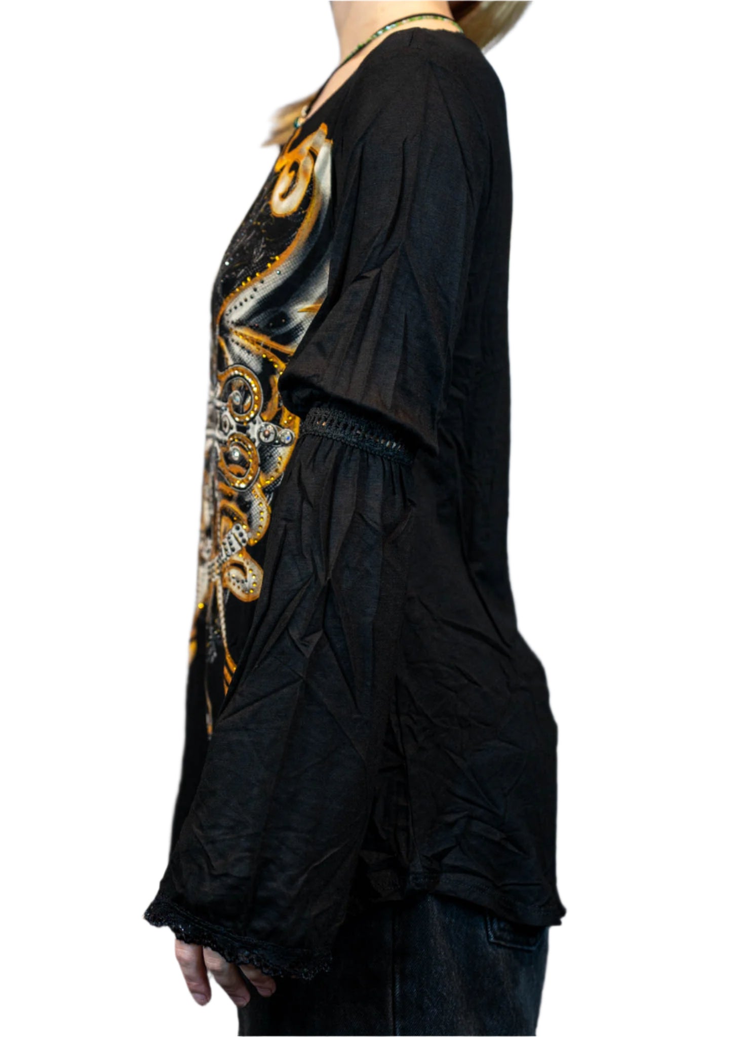• Attractive bell sleeves with lace trim to show off your free spirit side
