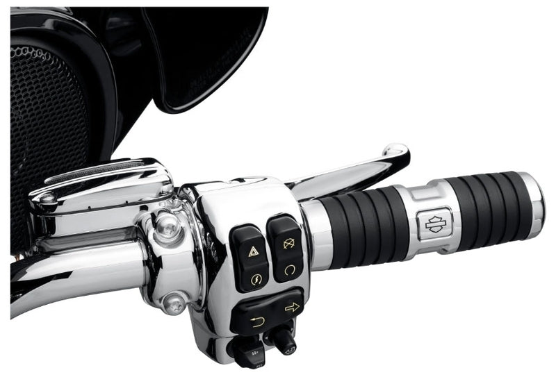 Add function and style to the Original Equipment hand controls on Touring models. Lighted Hand Controls feature soft white LED backlighting that illuminates the switch function icons for enhanced nighttime visibility.